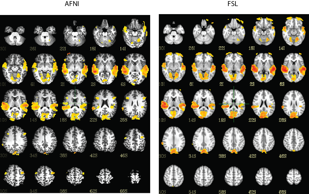 Always nice when there is agreement between different neuroimaging packages. A quick block design analyzed in both AFNI and FSL – giving pretty similar results for the same participant.